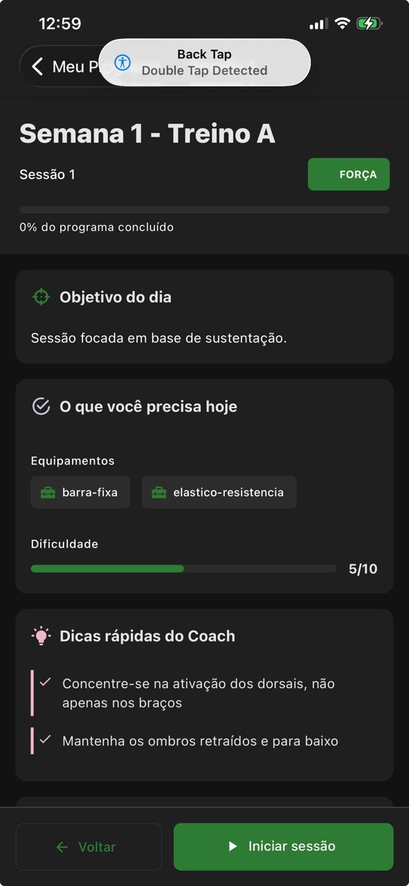 O CoachFit oferece uma experiência simples e direta: explorar um catálogo completo, filtrar por objetivo, nível e equipamento, escolher um programa e começar em minutos. Cada programa é uma jornada com sessões organizadas, foco claro e estrutura profissional — com recursos para acompanhar progresso, registrar histórico, fazer ajustes ao longo do caminho e manter a consistência. E, para tornar o processo mais motivador, o CoachFit também é social: a comunidade compartilha treinos concluídos, troca comentários e se inspira com a evolução de outras pessoas.